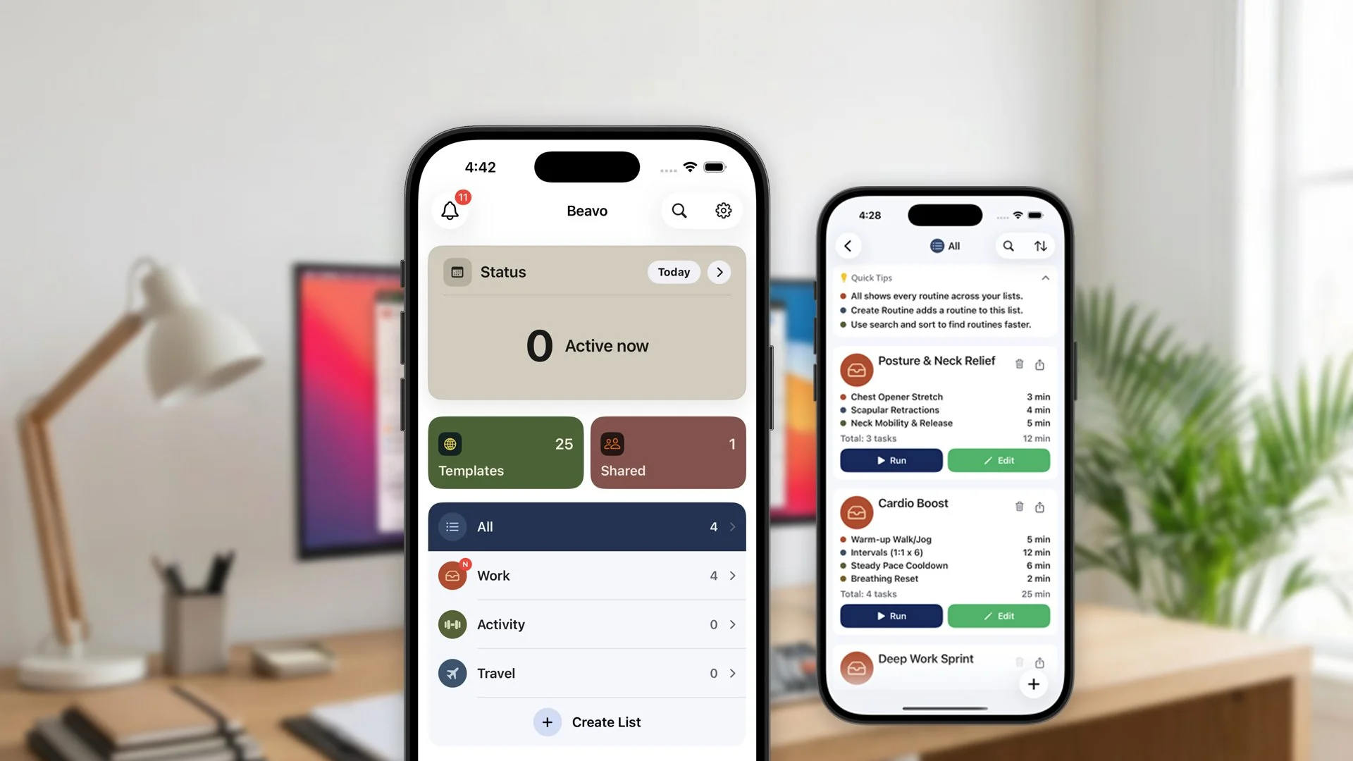 Beavo connects routines, timing, and flow into a cohesive system that helps you act with clarity and consistency.